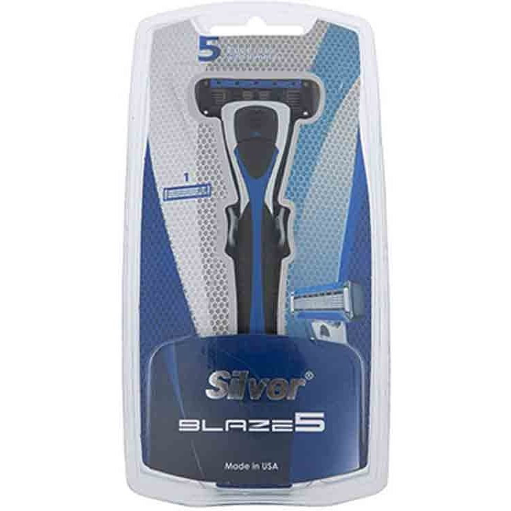 تیغ اصلاح مردانه سیلور مدل Blaze5، این تیغ دارای 5 لبه است که تمامی موها را در بر گرفته و هیچ مویی را جا نمی گذارد. این تیغهها از نوع سرامیکی است و در بالای آن یک تریمر برای ایجاد خط ریش قرار گرفته است. بر روی سری این محصول یک نوار ژلی وجود دارد که باعث روان شدن اصلاح می شود و به دلیل دارا بودن ویتامین E و آلوئه ورا مانع ایجاد حساسیت می شود. این محصول قابلیت تعویض تیغ را داشته و دسته ای ارگونومیک دارد که به خوبی در دست جای می گیرد.